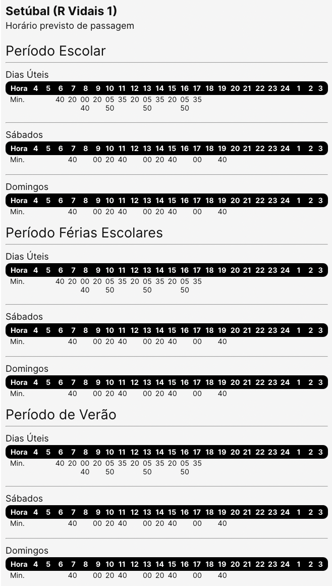 A informação de horários disponibilizada pelo portal é meramente consultiva pois esta informação pode nem sempre estar atualizada (devido às constantes alterações e ajustes diários feitos pelas empresas de transportes). Desta forma e em caso de dúvidas, aconselhamos a consulta da informação também nos sites oficiais das transportadoras.